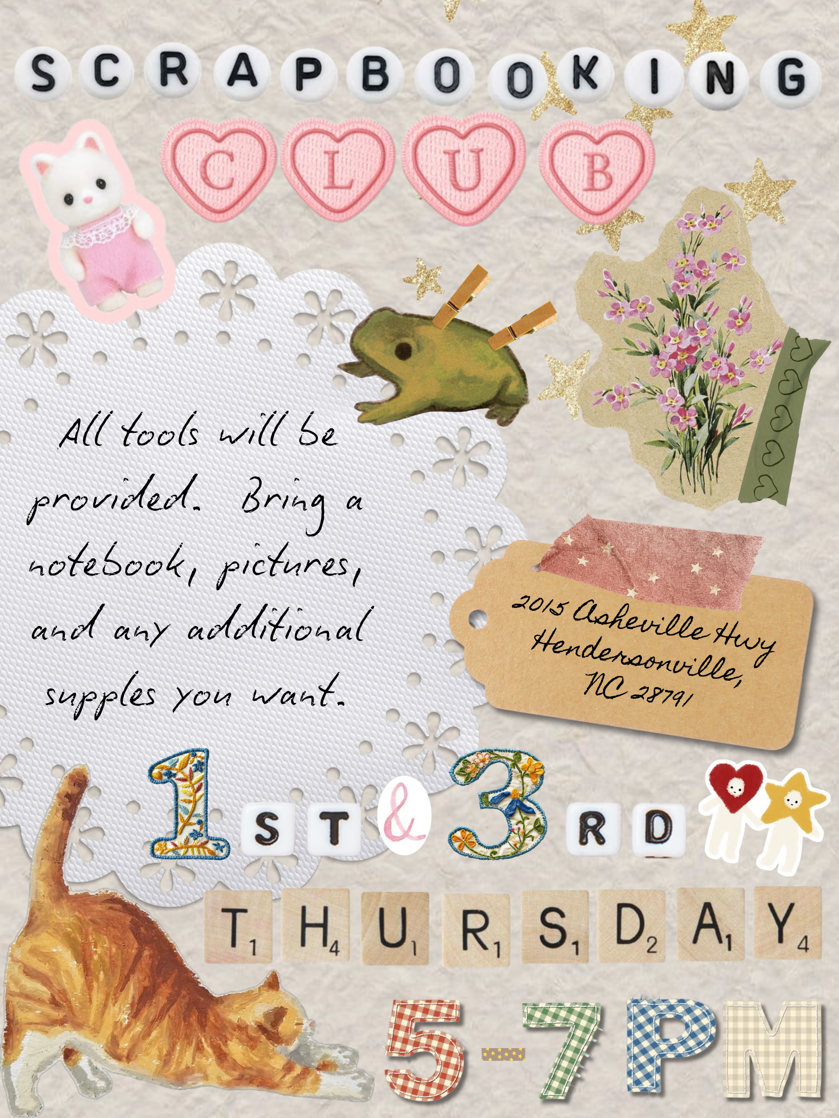 Join us for a creative evening of memory-making at our Scrapbooking Club! Whether you're a seasoned scrapbooker or just getting started, this is the perfect space to connect, craft, and capture your favorite moments. This is not a class, it's a club. The fee is a donation for supplies and tools, allowing us to continue growing and collecting fun materials.