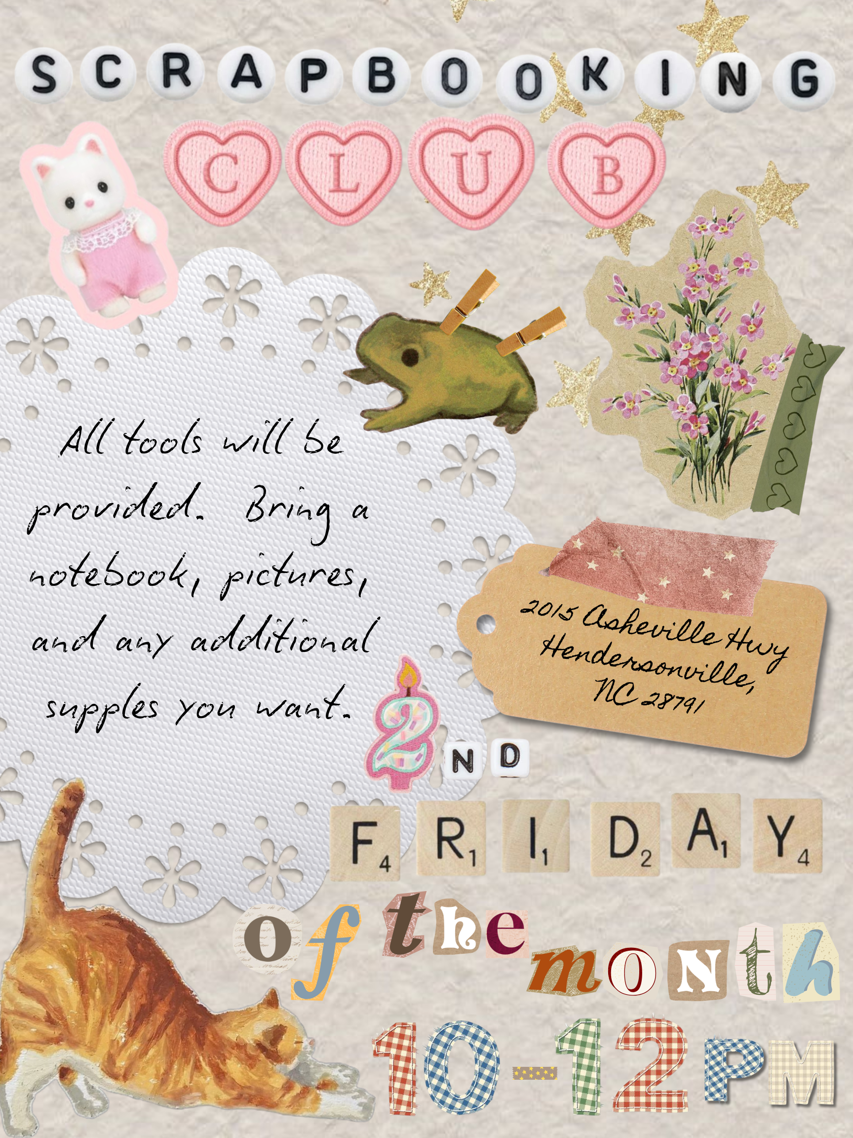 Join us for a creative evening of memory-making at our Scrapbooking Club! Whether you're a seasoned scrapbooker or just getting started, this is the perfect space to connect, craft, and capture your favorite moments. This is not a class, it's a club. The fee is a donation for supplies and tools, allowing us to continue growing and collecting fun materials.