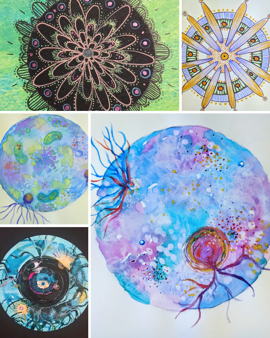 During this month’s session, we will use watercolor paints and mark-making tools to create a mandala drawing in the style of your choosing. Mandala is the Sanskrit word for circle. It is used in Eastern traditions as a tool of meditation. Mandalas include shapes and symbols that you create intuitively. Many mandalas have a repeated pattern of shapes that make a cohesive design, others do not and are abstract.